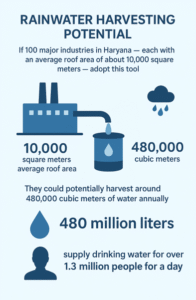 To illustrate the scale, if 100 major industries in Haryana—each with an average roof area of about 10,000 square meters—adopt this tool, they could potentially harvest around 480,000 cubic meters of water annually, based on the state’s average rainfall of 600 mm and a runoff coefficient of 0.8 for rooftops. This equates to roughly 480 million liters, enough to supply potable water for over 1.3 million people for a day, assuming average daily needs.